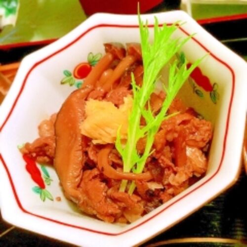 たんかく牛と茸の爽やか旨辛しぐれ煮料理名:しぐれ煮作者:嵯峨 恭也■材料(3人分)たんかく牛しゃぶしゃぶ用ロース肉 / 100gぶなしめじ / 1パックしょうが / 20g干し椎茸 / 2枚酒 / 大さじ2干し椎茸の戻し汁 / 150cc★本みりん / 大さじ2★三升漬 / 小さじ1/…