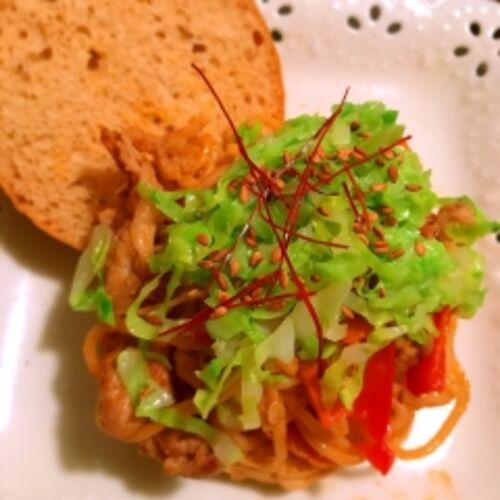 彩り野菜と豚肉のテンジャントマトケチャップ焼きそば作者:嵯峨 恭也■材料(1人分)豚こまぎれ肉 / 100g焼きそば麺 / 1玉春キャベツ / 2枚赤パプリカ(韓国産) / 正味35g人参 / 正味35gテンジャン(韓国産) / 大さじ1トマトケチャップ / 大さじ1★あらびきガ…